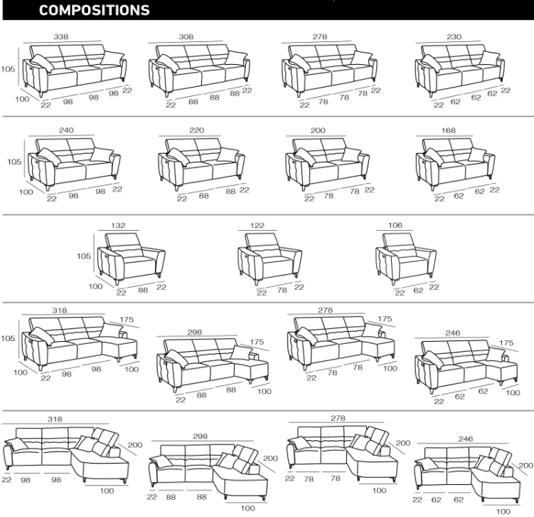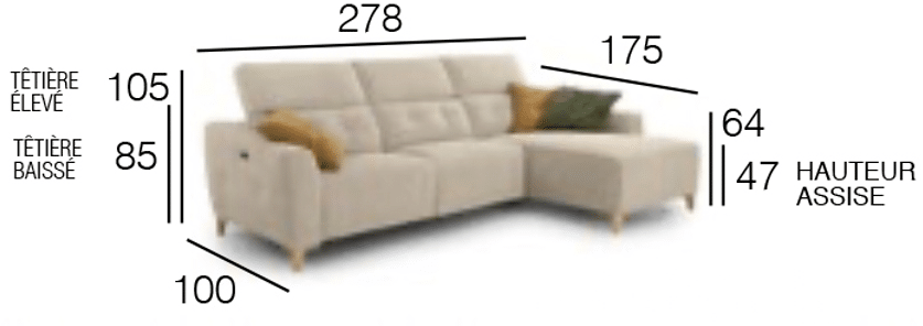 Observations : système relax dos-mur - Coussins décoratifs inclus - Chargeur USB dans les modules avec accoudoirs.