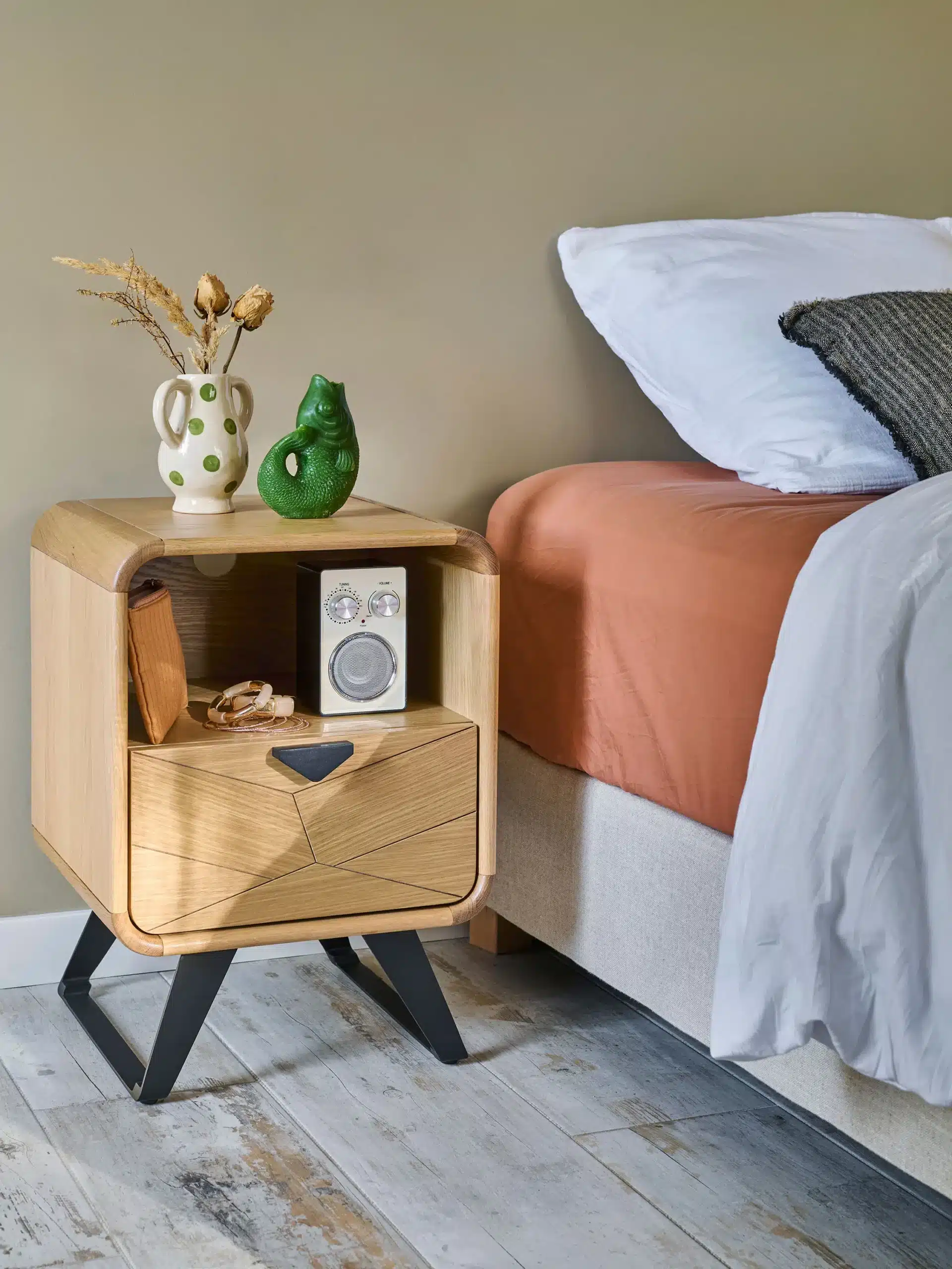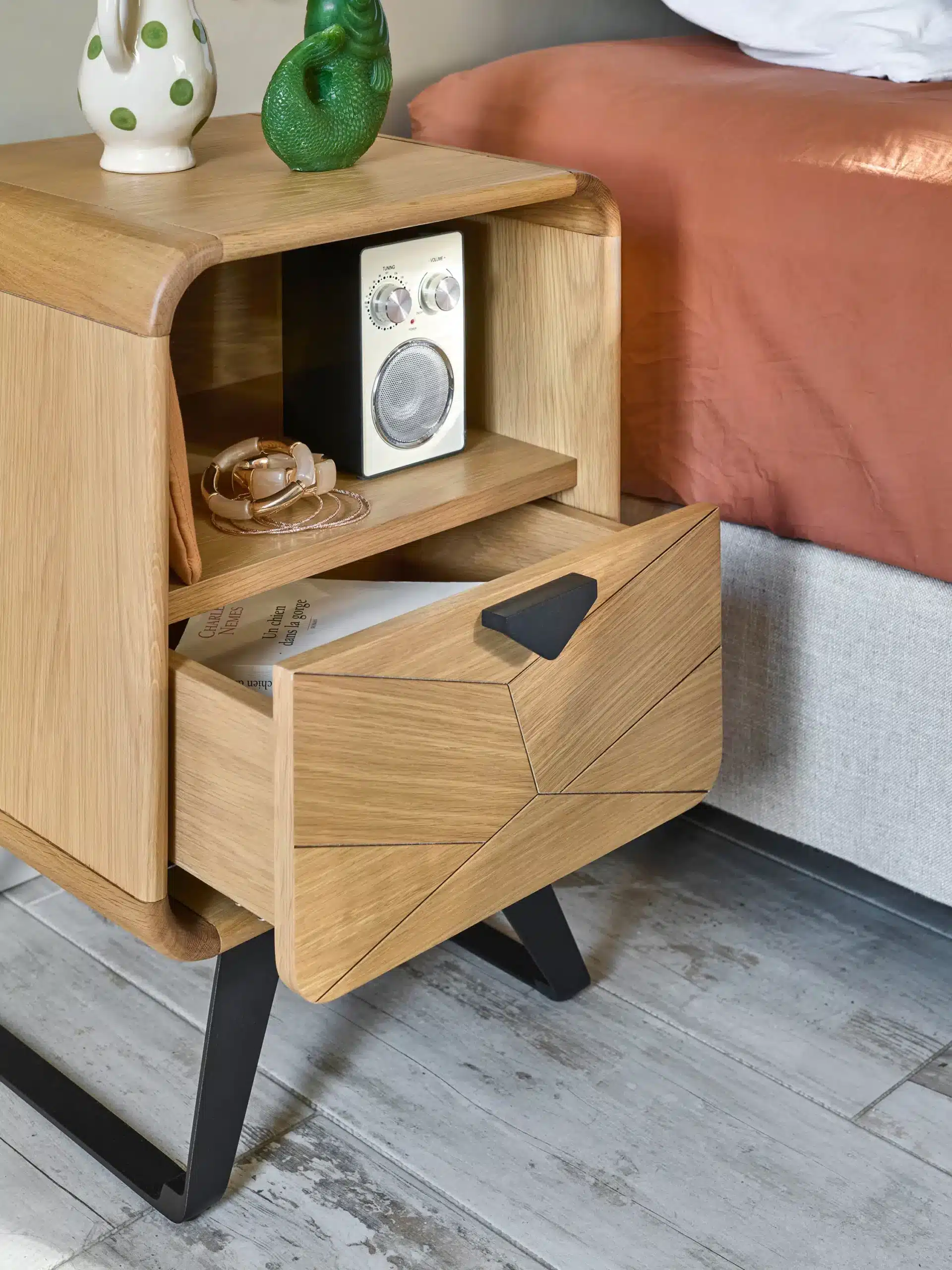 Tiroir : caisse en panneaux de particules revêtus de placage chêne, fond en panneaux de fibres moyenne densité revêtus de placage chêne.