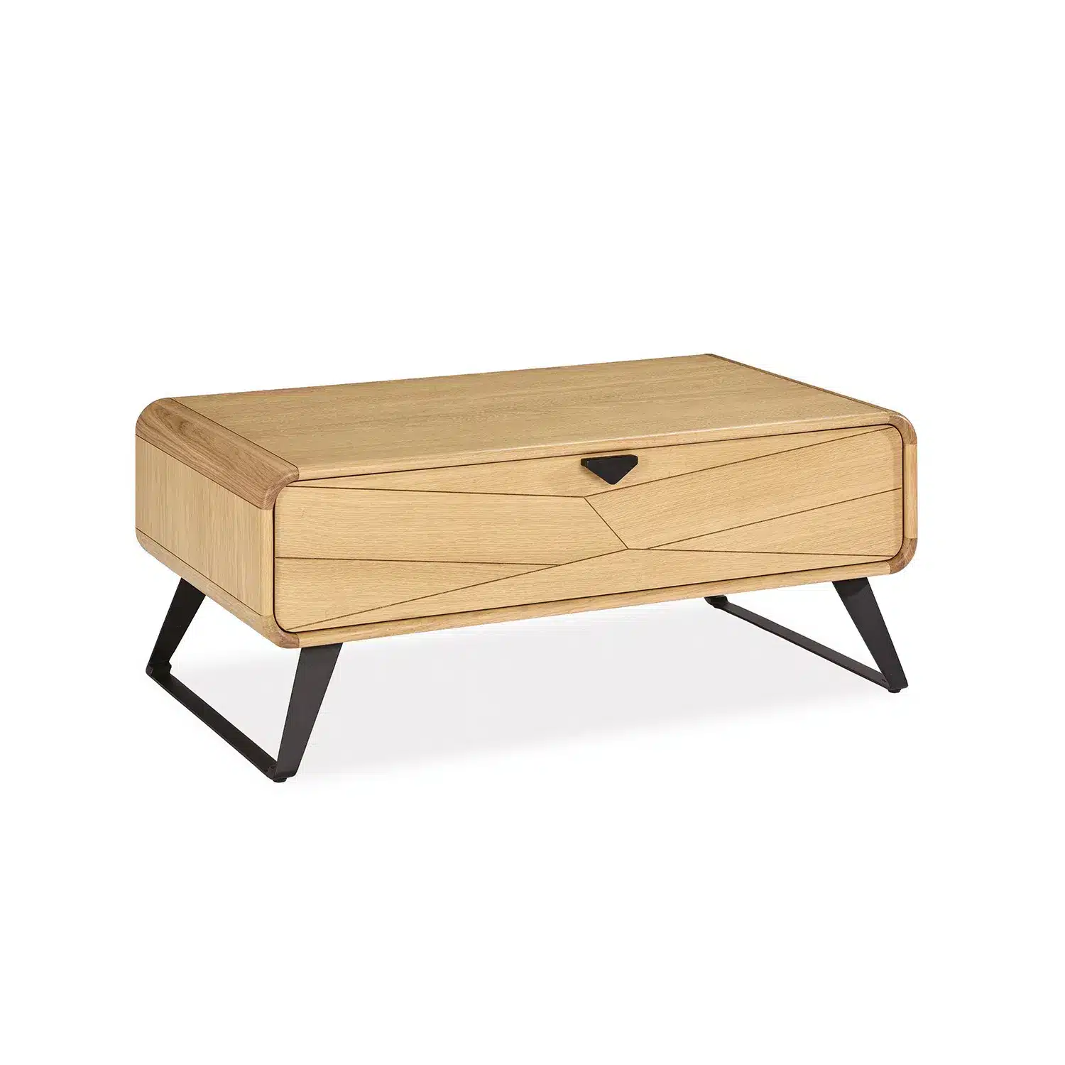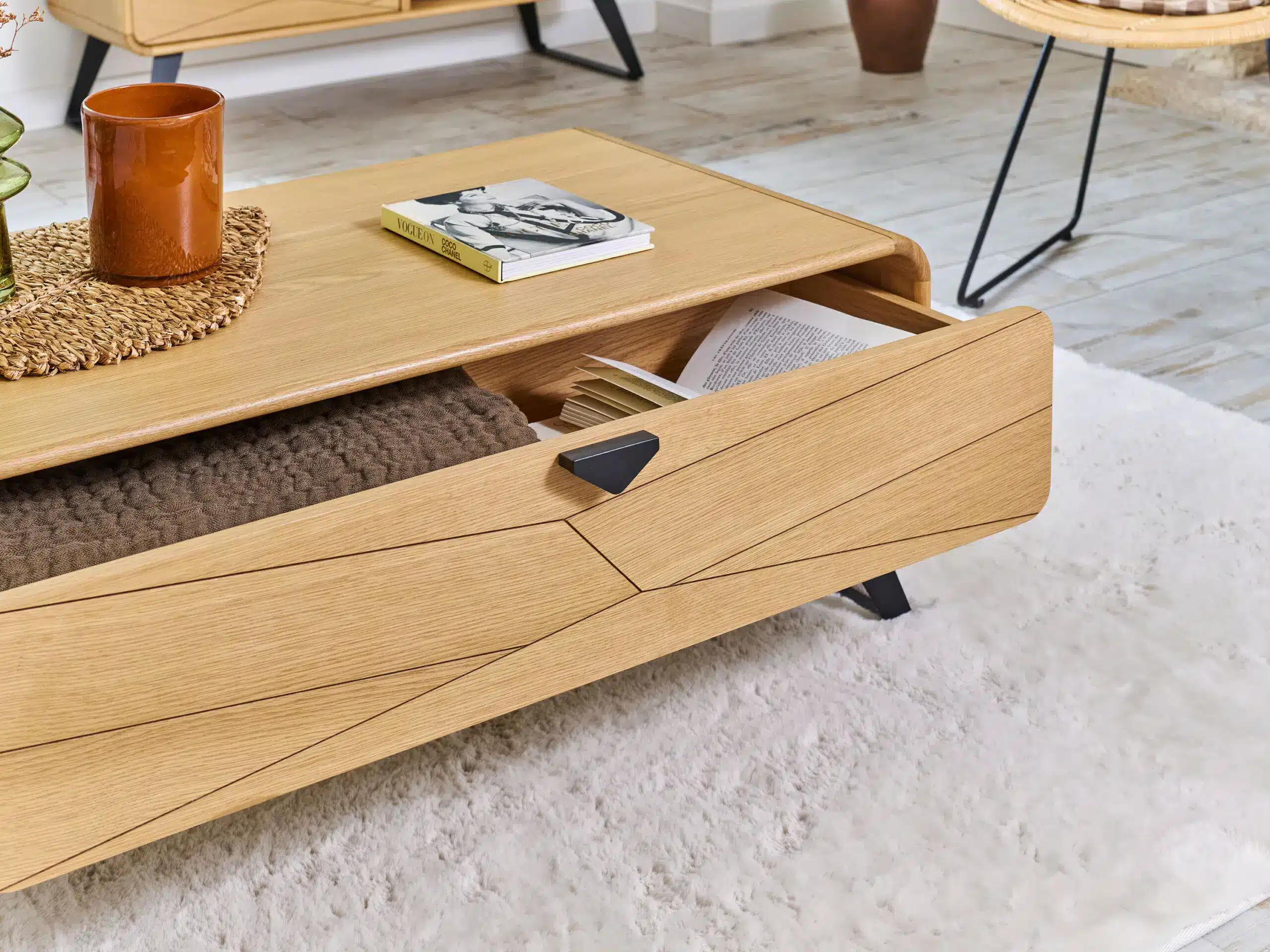 Tiroir : caisse en panneaux de particules revêtus de placage chêne, fond en panneaux de fibres moyenne densité revêtus de placage chêne.