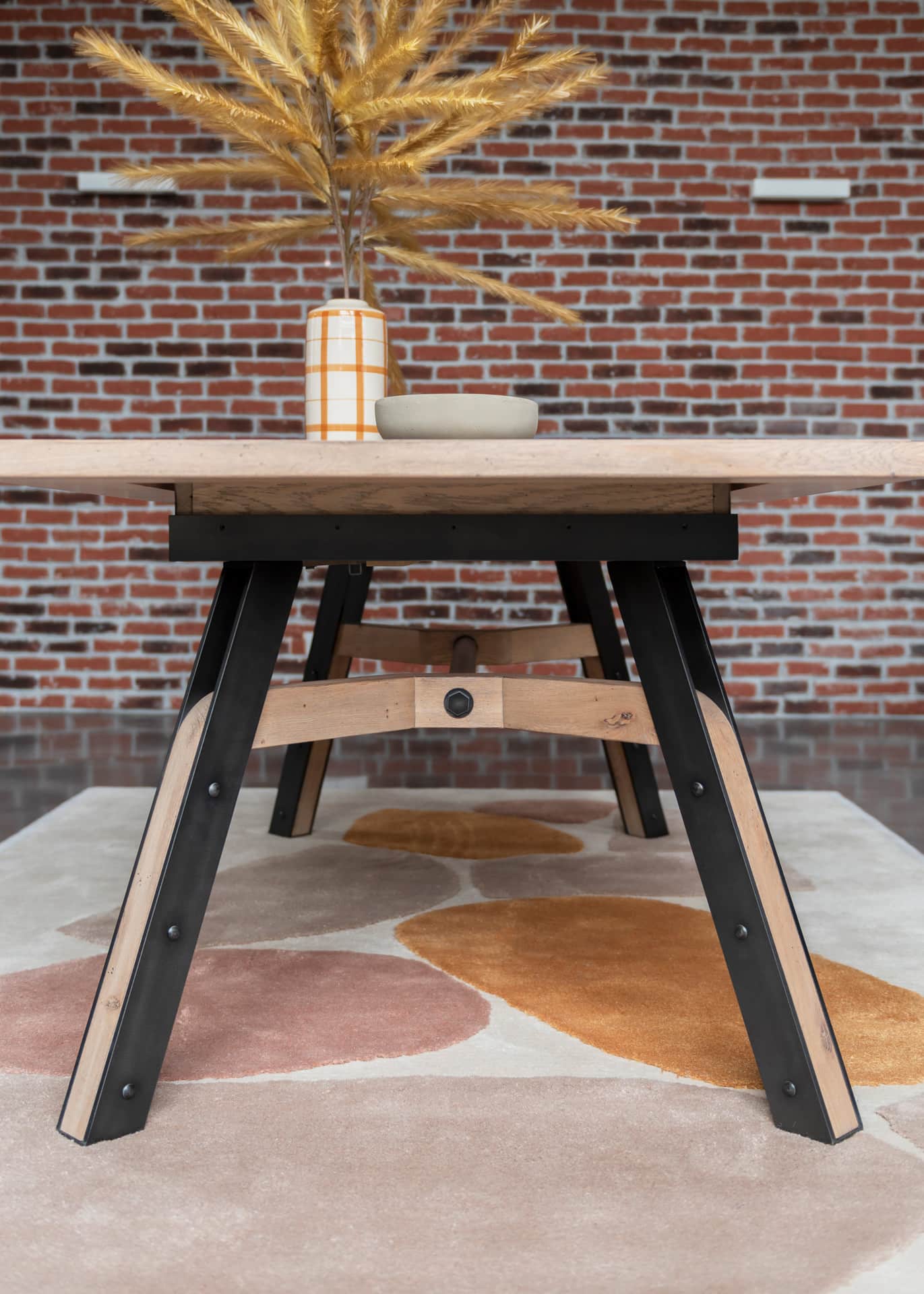 Plateau chêne massif avec incrustation cadre métallique composé d’un patchwork de bois